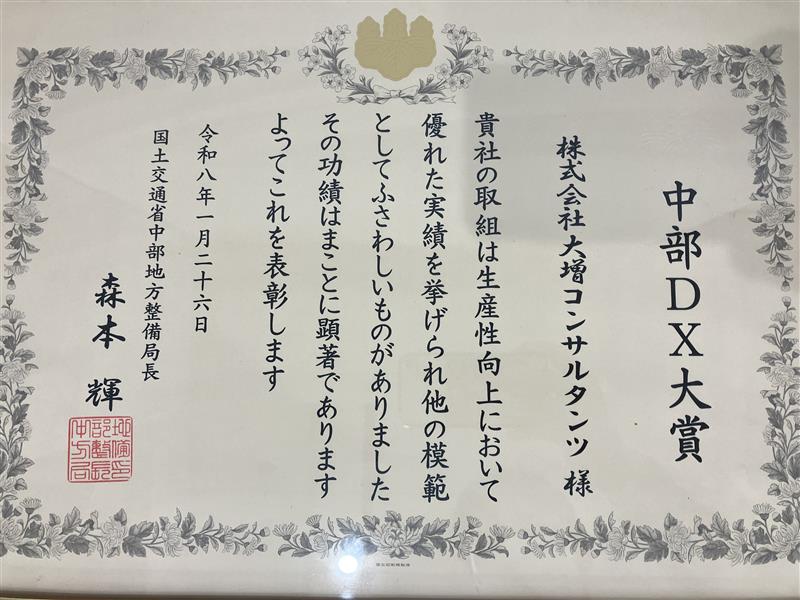 このたび弊社は、令和8年1月26日、国土交通省中部地方整備局より、「~中部からインフラDXをリードする”24”の優れた取組」として表彰対象に選出されたため、表彰状をいただきました。